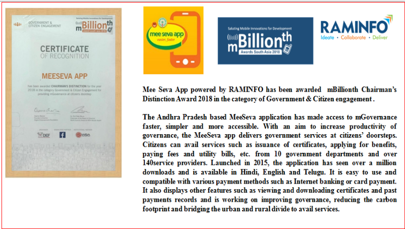 Mee Seva App powered by RAMINFO has been awarded mBillionth Chairman's Distinction Award 2018