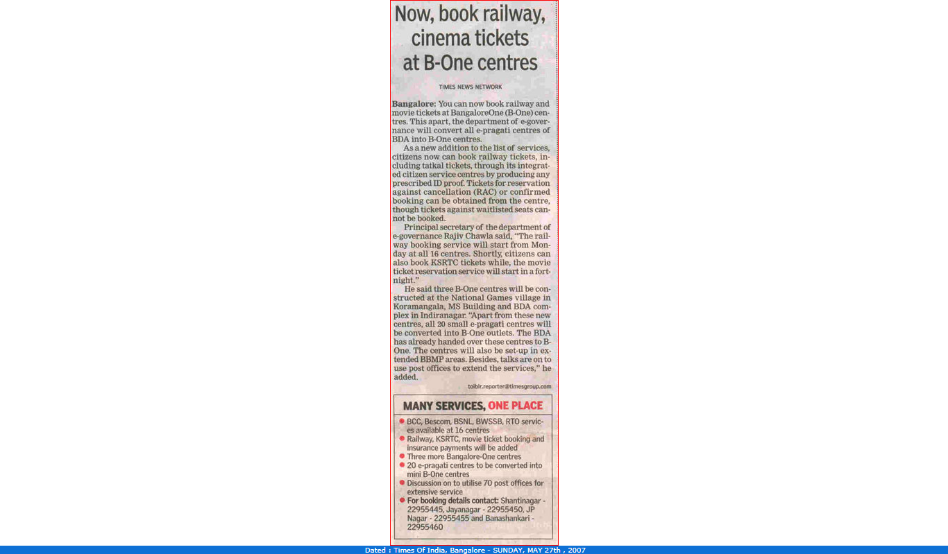 BangaloreOne centers will now add the sale of movie tickets to theirlist of services provided